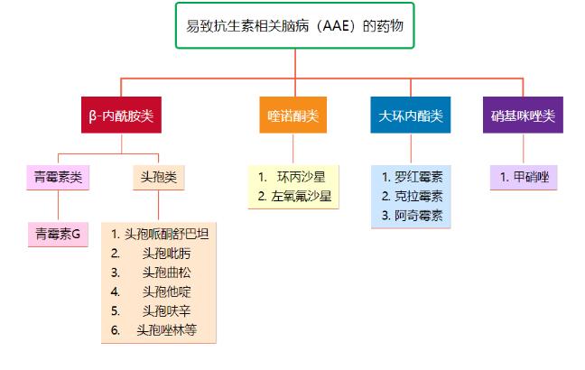 抗生素治療時出現(xiàn)妄想、幻覺、癲癇、抽搐等,結合患者的實驗室檢查考慮是否由抗生素引起的相關性腦病[2]。一旦考慮是抗生素腦病應該立即停藥或更換其他抗生素,嚴重者可使用地西泮、丙戊酸鈉、苯巴比妥等對癥治療,癥狀難以控制者可考慮使用血液透析清除體內(nèi)藥物。如果是聯(lián)合使用抗生素的患者出現(xiàn)抗生素相關性腦病,可以通過上面的分型圖考慮哪種抗生素可能性大,有利于后面的進一步治療。增加對抗生素腦病的認識可以更早的停止和調整抗生素,減少譫妄、癲癇、肌陣攣的持續(xù)時間,從而改善預后。