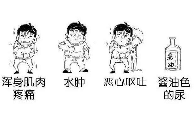 其次我們需要了解橫紋肌溶解的具體癥狀,做到自我預(yù)防。嚴(yán)重橫紋肌溶解的患者可出現(xiàn)典型的三聯(lián)癥:肌肉疼痛、乏力及深色尿。但是只有少數(shù)患者癥狀如此明顯,多數(shù)患者會(huì)出現(xiàn)類似流感樣的特異性不大的癥狀,例如發(fā)燒、惡心、嘔吐、乏力、肌肉疼痛等,還可能伴有腹痛。這些癥狀很容易讓我們誤以為是一般的流感。