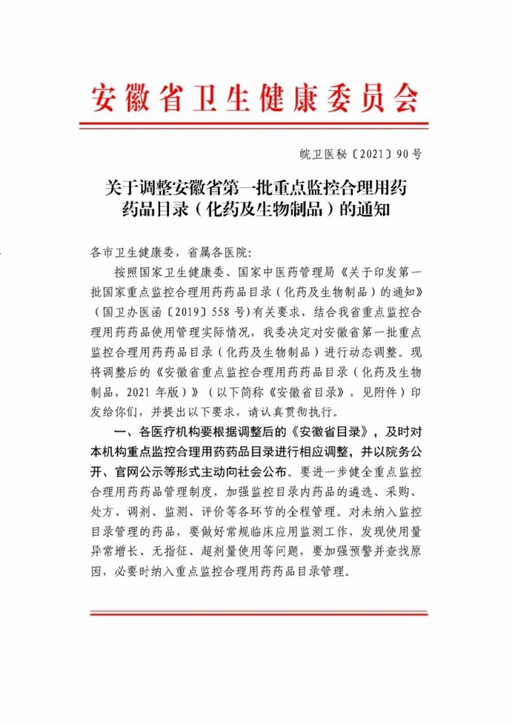 [政策法規(guī)]關(guān)于調(diào)整安徽省第一批重點(diǎn)監(jiān)控合理用藥藥品目錄(化藥及生物制品)的通知