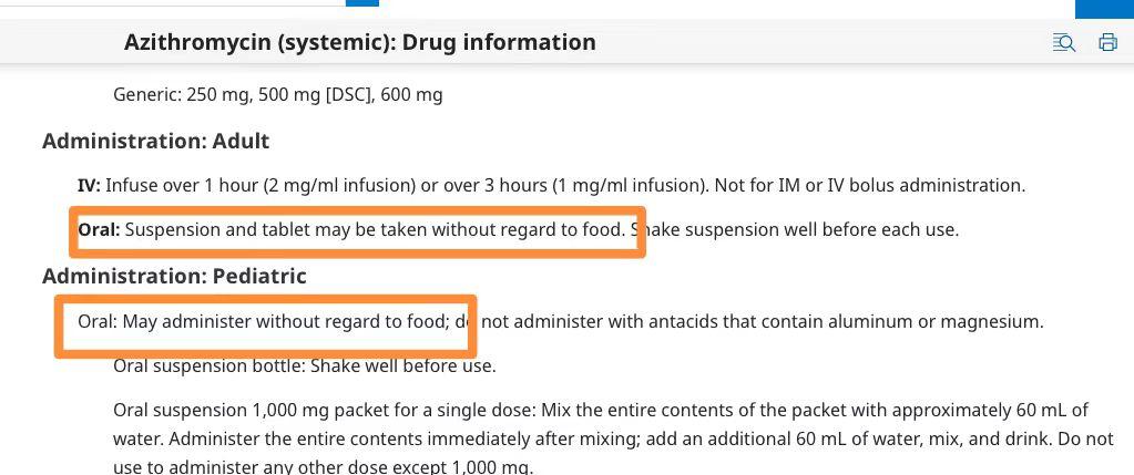 而《中國(guó)國(guó)家處方集》阿奇霉素的用法用量:口服,餐前1小時(shí)或餐后2小時(shí)服用。uptodate對(duì)于此的看法:口服不用考慮食物。也就是,與食物同服或者不同服均可。