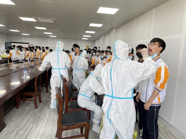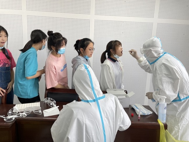 在采集現(xiàn)場(chǎng),我院核酸采集隊(duì)員全副武裝,嚴(yán)格落實(shí)個(gè)人防護(hù)要求,師生佩戴口罩。采樣人員按照學(xué)生年級(jí)共分為三組,在工作人員和老師們的共同努力下,各項(xiàng)工作開(kāi)展井然有序,以班級(jí)為單位,有序的分批次、錯(cuò)峰到達(dá)指定采樣地點(diǎn)。“張開(kāi)嘴,啊……”醫(yī)護(hù)人員一邊正確的引導(dǎo),一邊迅速地完成咽拭子采集,整個(gè)過(guò)程,前后不到20秒。