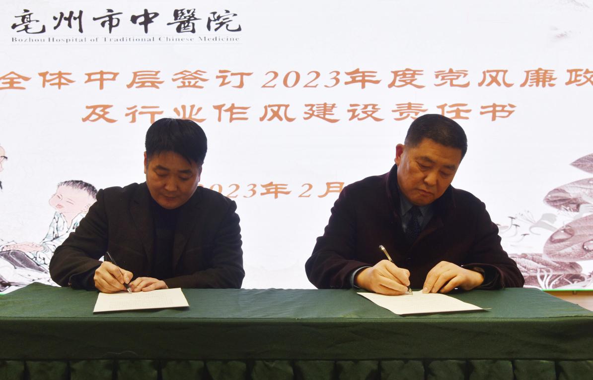 會(huì)上,醫(yī)院黨委書(shū)記唐超與我院中層干部123人簽定《亳州市中醫(yī)院2023年度黨風(fēng)廉政及行業(yè)作風(fēng)建設(shè)責(zé)任書(shū)》,要求中層完成全體職工1054人《廉潔自律責(zé)任書(shū)》簽定工作。