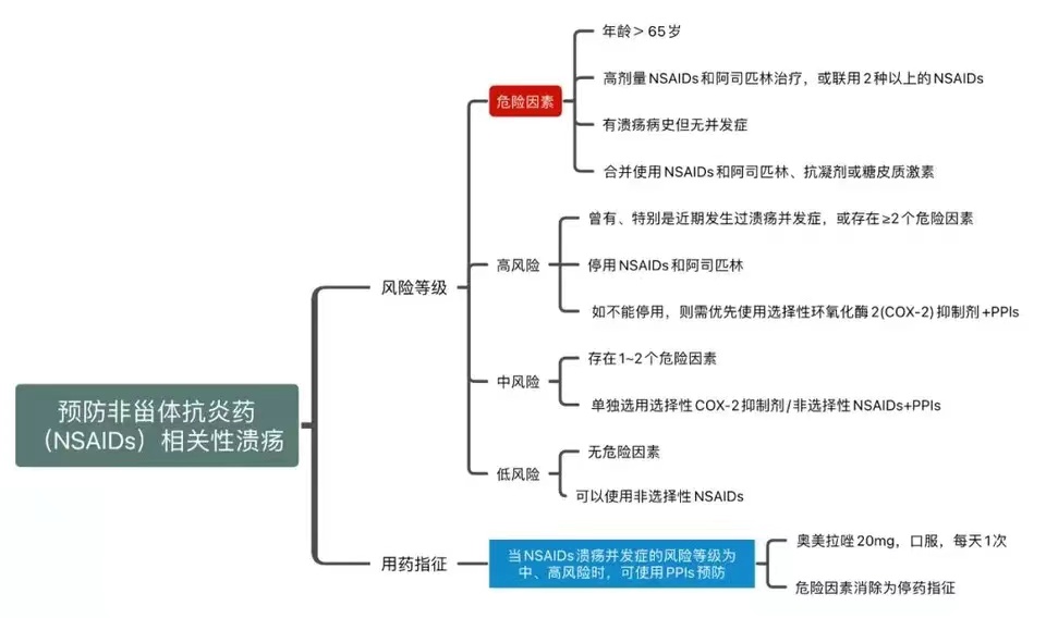 用于NSAIDs相關(guān)性潰瘍的預(yù)防時:對于曾有、特別是近期發(fā)生潰瘍并發(fā)癥或存在1個及以上危險因素a的患者,應(yīng)給予奧美拉唑20mg,口服,每天1次;使用雙聯(lián)抗血小板治療存在上消化道出血高風(fēng)險的患者,聯(lián)合使用奧美拉唑3~6個月,6個月后改為H2受體阻滯劑或間斷服用。