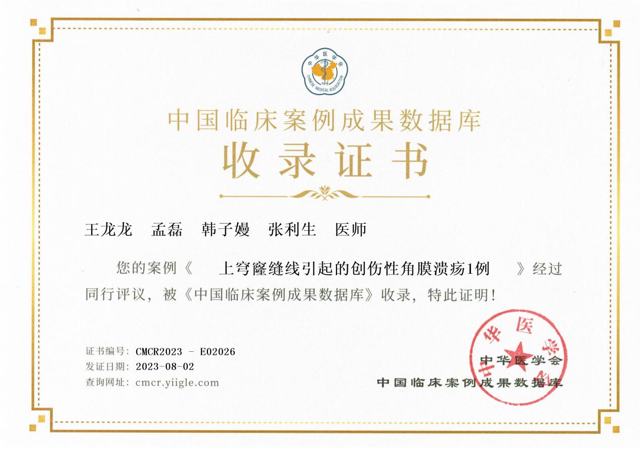 近日,我院眼科王龍龍、孟磊、韓子嫚、張利生醫(yī)師的臨床案例成果《上穹窿縫線引起的創(chuàng)傷性角膜潰瘍1例》被中國臨床案例成果數(shù)據(jù)庫(CMCR)收錄并頒發(fā)了收錄證書(案例閱讀網(wǎng)址https://rs.yiigle.com/cmaid/1468285)。