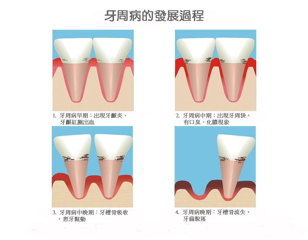 當(dāng)炎癥擴(kuò)延到深部牙周組織時(shí),即可發(fā)展成為牙周炎。牙周炎在臨床常表現(xiàn)為:牙齦炎癥和出血,牙周袋的形成,牙槽骨吸收,牙松動(dòng)和移位。若沒(méi)及時(shí)進(jìn)行牙周治療,重度牙周炎則有伴發(fā)病變,如牙周-牙髓聯(lián)合病變,牙周膿腫,牙齦退縮和牙根面敏感等。